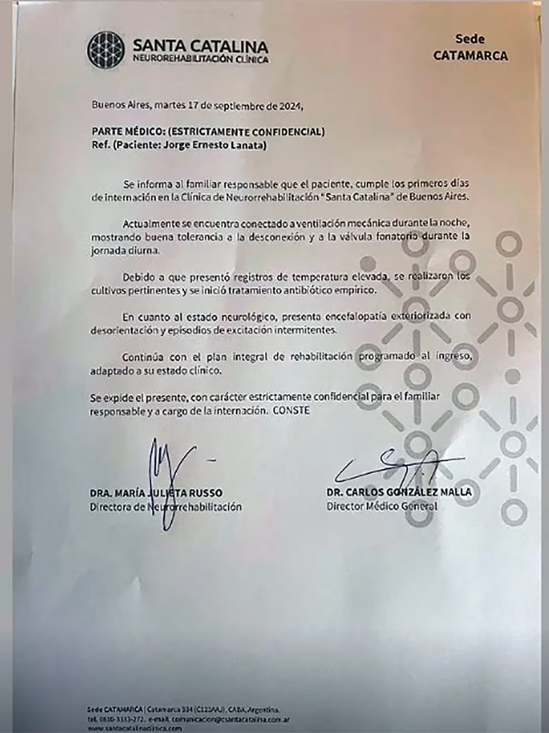 Personal de la clínica Santa Catalina, especializada en neurorehabilitación, difundió en la noche del martes el primer parte médico sobre la salud del periodista. En el mismo, se señalaba que el paciente se encontraba conectado a ventilación mecánica, pero registraba aceptable tolerancia a la desconexión y a la válvula fonatoria durante el día.