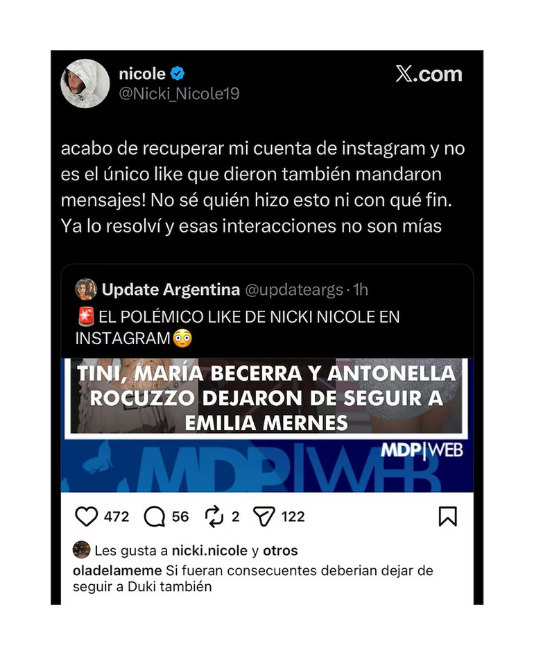 Todo comenzó cuando usuarios atentos a los movimientos de los artistas repararon en que la cuenta oficial de Nicki en Instagram había dado un like a un posteo que parecía estar en contra de Emilia. El mensaje en cuestión, lejos de pasar desapercibido, fue rápidamente viralizado. “Si fueran consecuentes debería dejar de seguir a Duki también”, se leía en la descripción, en referencia a la relación entre Emilia y el trapero. La reacción no tardó en llegar y las redes sociales estallaron con teorías, capturas y mensajes cruzados sobre el supuesto posicionamiento de la rosarina en la interna que divide actualmente a las estrellas del pop.