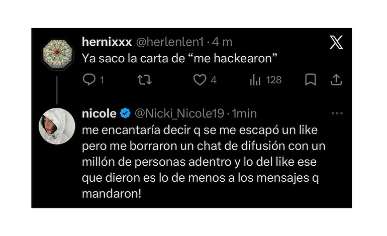 Ante la falta de confianza de parte de algunos seguidores, Nicki profundizó su descargo: “Me encantaría decir que se me escapó un like, pero me borraron un chat de difusión con un millón de personas adentro y lo del like ese que dieron es lo de menos a los mensajes que mandaron”.