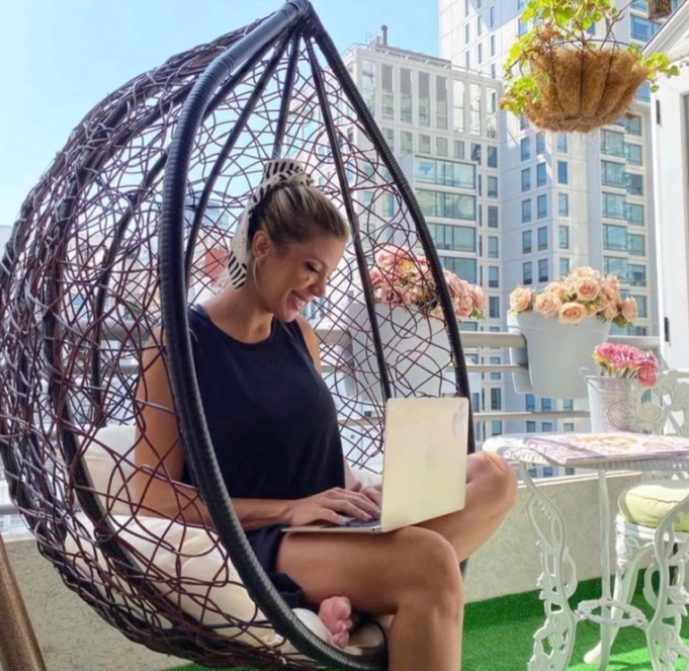 Uno de los lugares que más disfruta de la casa, sobre todo cuando las buenas temperaturas acompañan, es el balcón. En el cual Virginia tiene todo adornado con plantas, flores y césped sintético para darle un ambiente natural, una mesa de hierro junto a una silla y dos hamacas: una colgante y la otra de pie.