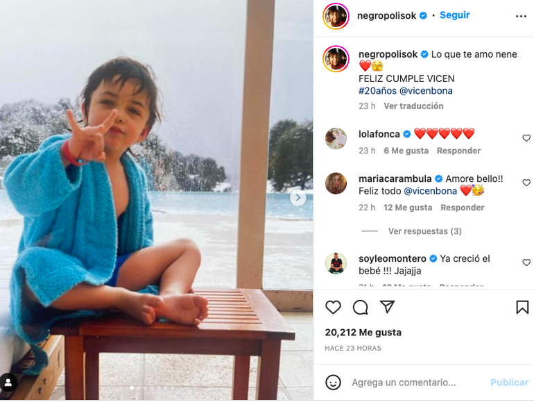 "Lo que te amo, nene. FELIZ CUMPLE VICEN. #20años", dijo la mediática junto a un par de fotos del pasado que sirvió para recordar todos los momentos vividos junto a su querido hijo.