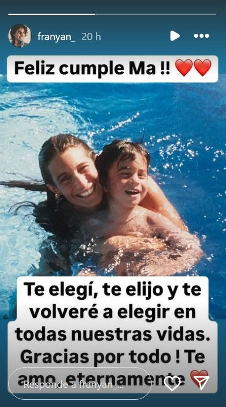 Franco Giordano, el mayor de los hijos de Romina, le dedicó una historia de Instagram a su mamá. El nieto de Cris Morena subió una foto junto a su mamá donde escribió “Feliz cumple ma!! Te elegí, te elijo y te volveré a elegir en todas nuestras vidas. Gracias por todo! Te amo eternamente”. Este heredó la pasión por la actuación de su madre.
