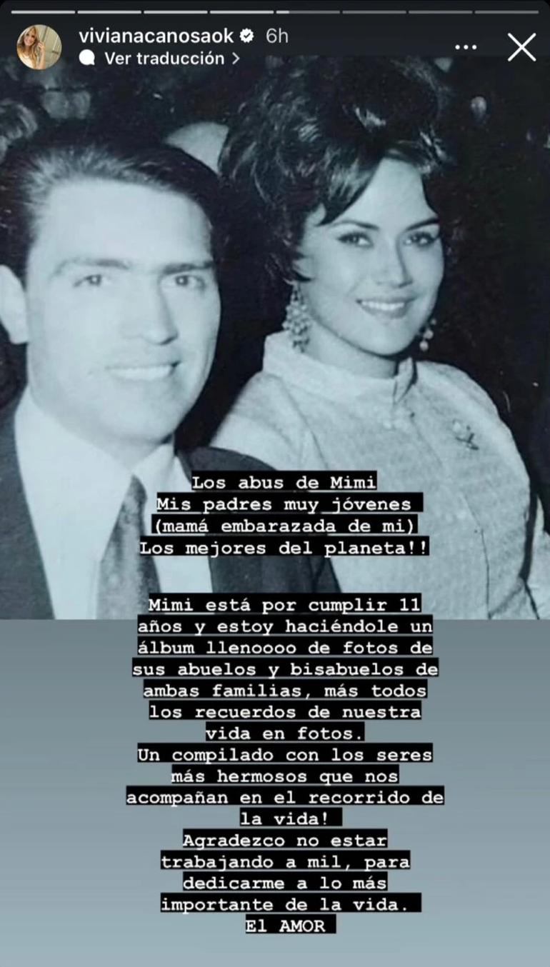 "Mimi está por cumplir 11 años y estoy haciéndole un álbum lleno de fotos de sus abuelos y bisabuelos de ambas familias, más todos los recuerdos de nuestra vida en fotos", reveló Canosa en esa imagen de sus padres. Y añadió: "¡Un compilado con los seres más hermosos que nos acompañan en el recorrido de la vida! Agradezco no estar trabajando a mil para dedicarme a lo más importante de la vida. El amor".