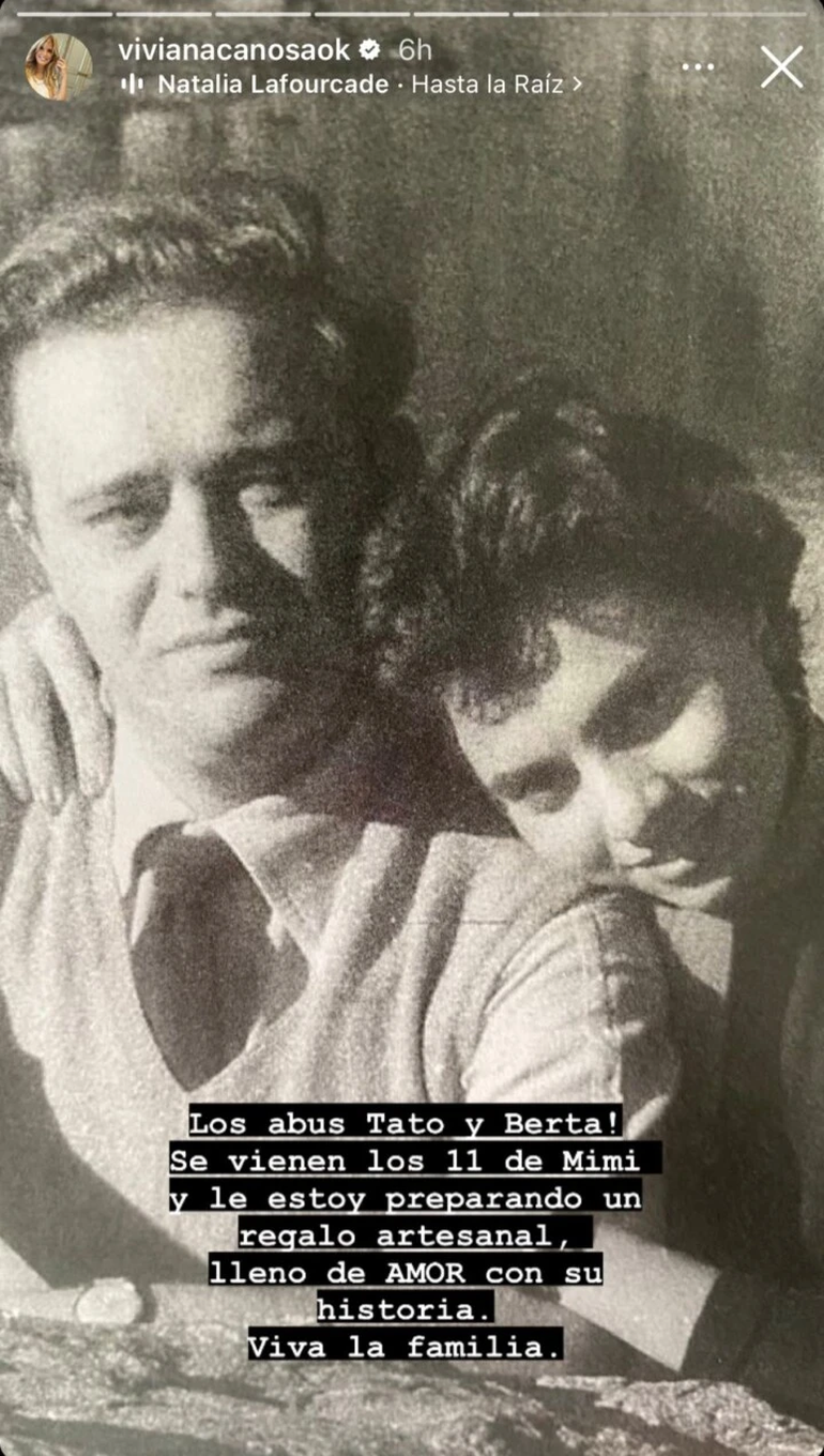 "¡Los abus Tato y Berta! Se vienen los 11 de Mimi y le estoy preparando un regalo artesanal, lleno de amor con su historia. Viva la familia", completó Canosa sobre una foto de Tato Bores y Berta Szpindler, los abuelos paternos de su hija, que ella eligió para incluir en el mencionado álbum.