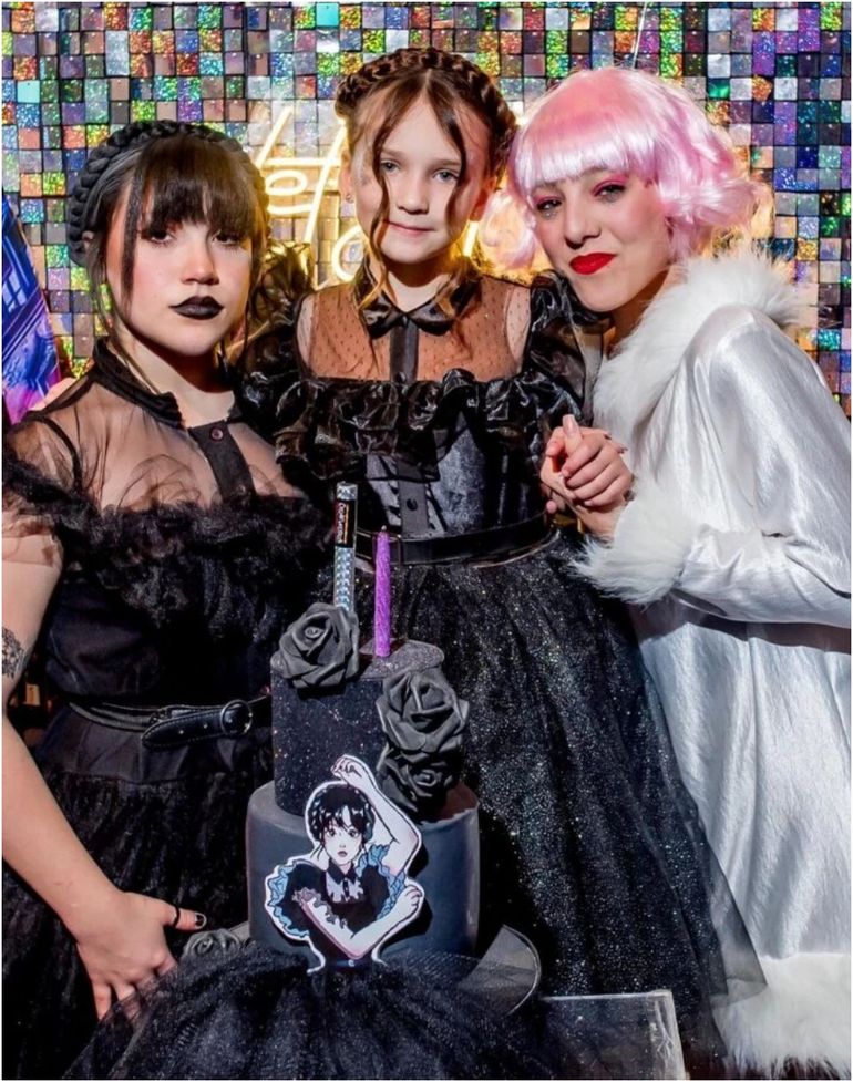El evento incluyó una animación basada en la serie, donde aparecieron otros personajes. Además, la torta y la decoración siguieron la temática de "Merlina" (la torta estaba cubierta de mazapán negro y tenía flores negras comestibles).