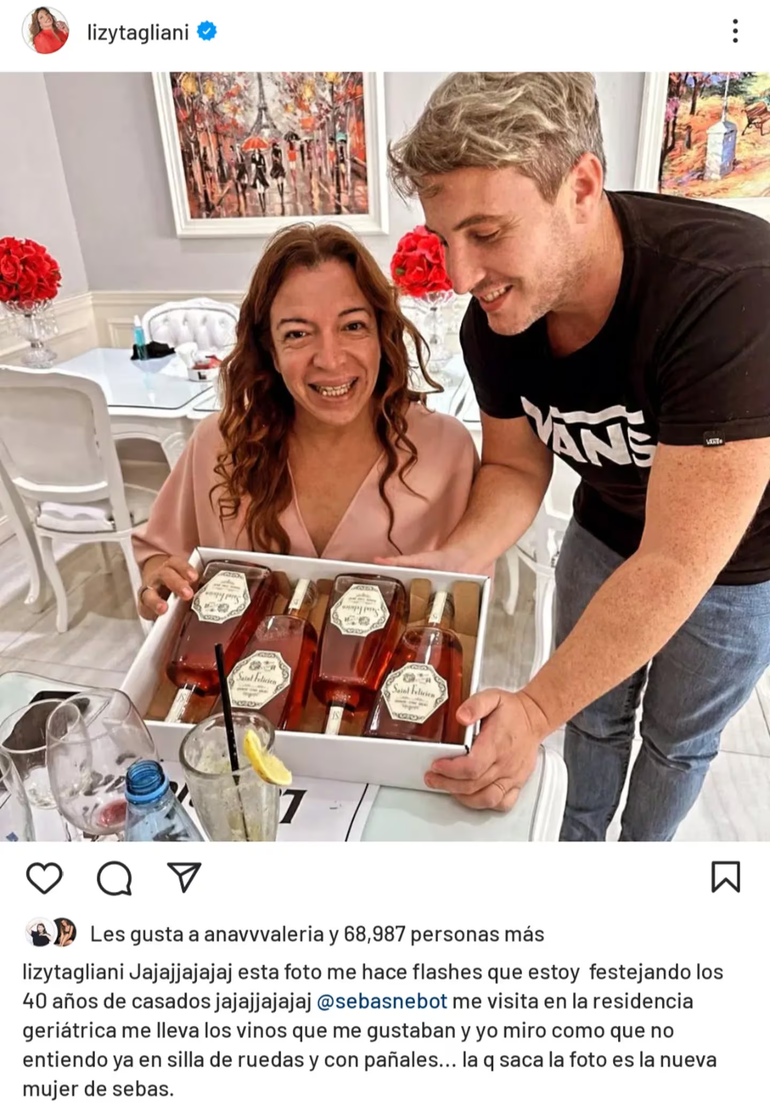 Este fin de semana, Lizy Tagliani subió una postal junto a Sebastián Nebot para contarles a sus seguidores que cumplieron un año de casados. En la publicación se lo veía a él regalándole una caja con bebidas alcohólicas.