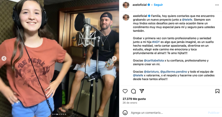 El artista acompañó en su debut en la música a su hija mayor, luego de incursionar en un desafío profesional, que contó con la participación de la adolescente como cantante. Axel se manifestó en sus redes sociales y compartió una foto de Águeda junto a él en un estudio de grabación, donde no pudo disimular su emoción.