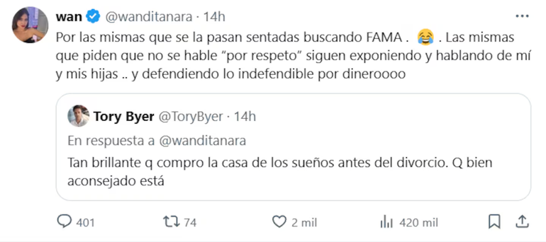 En otro posteo, la mediática acusó a las abogadas de Icardi de “busca fama” e interesadas: “Por las mismas que se la pasan sentadas buscando fama. Las mismas que piden que no se hable ‘por respeto’, siguen exponiendo y hablando de mí y mis hijas... y defendiendo lo indefendible por dinero”.