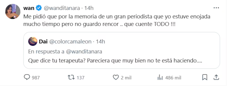 “¿Que dice tu terapeuta? Pareciera que muy bien no te está haciendo…" , le preguntó un usuario y ella contestó picantísima: “Me pidió que por la memoria de un gran periodista que yo estuve enojada mucho tiempo pero no guardo rencor... que cuente todo”.