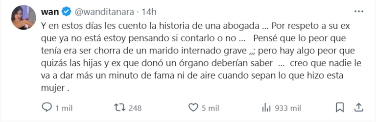 “Y en estos días les cuento la historia de una abogada… por respeto a su ex, que ya no está, estoy pensando si contarlo o no… pensé que lo peor que tenía era ser ‘chorra’ de un marido internado grave, pero hay algo peor que quizás las hijas y ex que donó un órgano deberían saber. Creo que nadie le va a dar más un minuto de fama ni de aire cuando sepan lo que hizo", escribió picantísima.