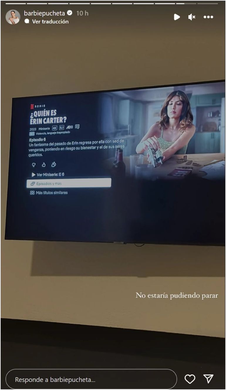 "No estaría pudiendo parar...", expresó Barbie Vélez en una publicación en la red social, junto a una foto de su televisor que muestra que está viendo la serie "¿Quién es Erin Carter?" en Netflix.