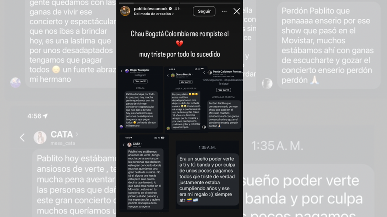 El evento de Damas Gratis se convirtió en una verdadera pesadilla y en medio del caos, Pablo Lescano, líder y cantante de la banda, se manifestó en sus redes sociales. “Chau Bogotá, Colombia me rompiste el corazón, muy triste por todo lo sucedido”, escribió en una historia que acompaño de capturas de mensajes directos de seguidores y miembros de la organización del evento.