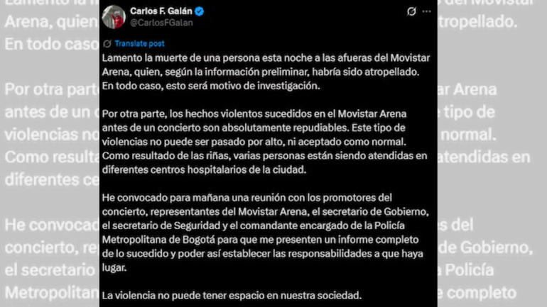 Los incidentes continuaron en los alrededores del estadio y el alcalde de Bogotá, Carlos Fernando Galán lamentó el fallecimiento de una persona que, aparentemente, habría sido atropellada. “Los hechos violentos sucedidos en el Movistar Arena antes de un concierto son absolutamente repudiables. Este tipo de violencias no puede ser pasado por alto, ni aceptado como normal. Como resultado de las riñas, varias personas están siendo atendidas en diferentes centros hospitalarios de la ciudad”, escribió el alcalde en un comunicado que viralizó.