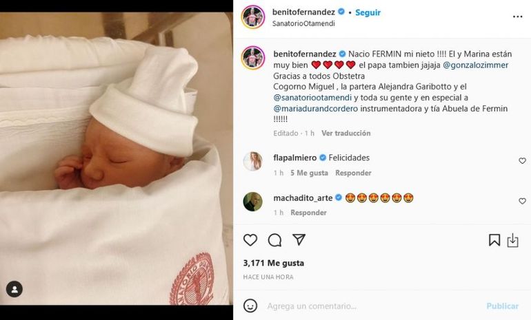 "Nació Fermín, mi nieto. Él y Marina están muy bien. El papá, Gonzalo, también", publicó el reconocido diseñador junto a varios corazones, tratando de demostrar el amor que le genera la llegada de su nieto y la emoción por la situación que se encuentra viviendo actualmente.
