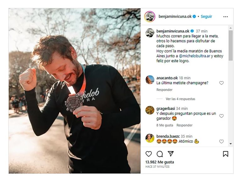 Este domingo, más de 23 mil corredores participaron en la emocionante media maratón de Buenos Aires, y entre ellos se destacó la presencia del reconocido actor Benjamín Vicuña. Luego de cruzar la línea de llegada y recibir su merecida medalla, Vicuña compartió sus sensaciones en las redes sociales, resaltando su enfoque en disfrutar cada paso de la competencia.
