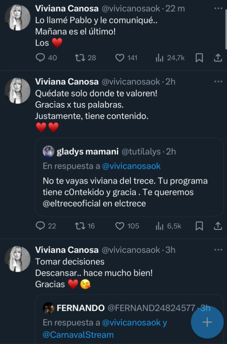 En los últimos días, Canosa cargó con dureza contra la producción de El Trece, justo después de confirmarse el cierre anticipado de su ciclo. Aunque su contrato vencía el 31 de julio, ella decidió retirarse antes y comunicó su salida primero por X y luego en vivo por Carnaval Stream el 24 de julio.