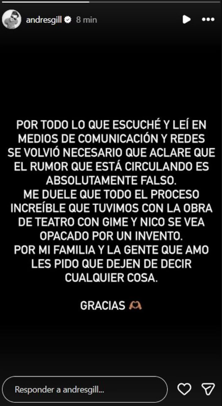 En las últimas semanas, el mundo del espectáculo se vio sacudido por la noticia de la separación entre Nico Vázquez y Gimena Accardi. La ruptura no solo generó repercusión por tratarse de una de las parejas más queridas del ambiente, sino también por las declaraciones posteriores de la actriz, quien reconoció haber sido infiel. A partir de allí, comenzaron a circular especulaciones que involucraron a terceros, y uno de los nombres señalados fue el de Andrés Gil, actual pareja de Cande Vetrano y padre de su hijo Pino. El actor, al verse en medio de este vendaval mediático, no tardó en salir a dar su versión.