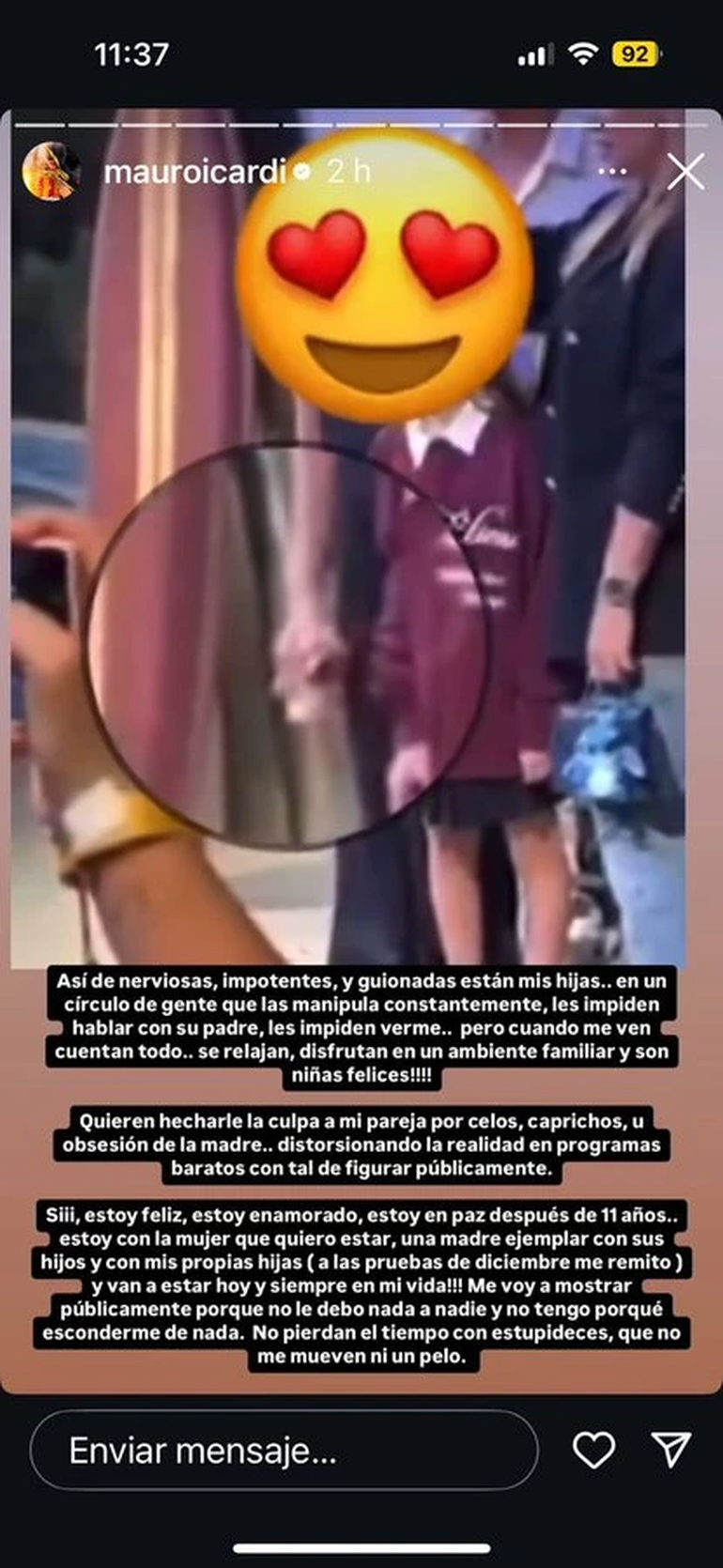 En cuanto a su situación personal, Mauro Icardi intentó decirle al mundo, pero en especial a su ex, la siempre polémica y mediática Wanda Nara, que "síiii, estos feliz, estoy enamorado, estoy en paz después de 11 años. Estoy con la mujer que quiero estar, una madre ejemplar con sus hijos y con mis propias hijas. A las pruebas de diciembre me remito".