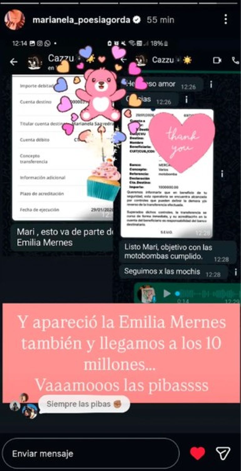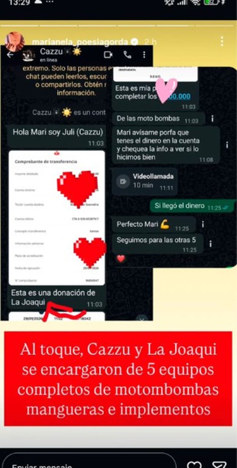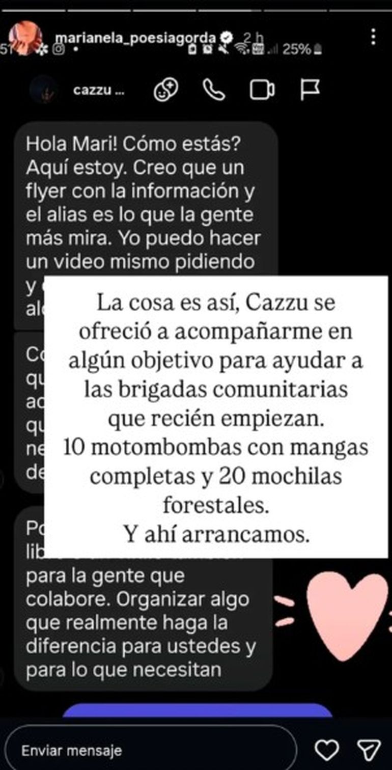 El objetivo de Marianela fue claro: conseguir 10 motobombas y 30 mochilas de agua. Con la colecta circulando por las redes sociales, la autora de la iniciativa recibió ayuda de distintas personalidades como la cantante Cazzu que se comunicó con ella y colaboró con dinero. "Esto se desmadró para bien. Las mujeres del arte llegaron”, dijo Marianela.