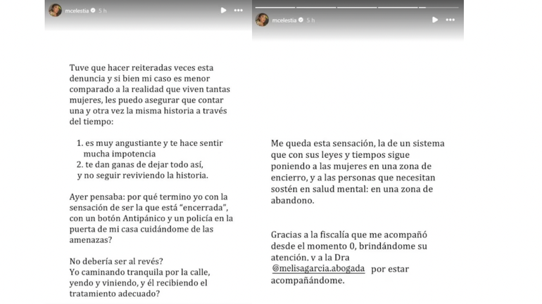 “Si bien mi caso es menor comparado a la realidad que viven tantas mujeres, les pudo asegurar que contar una y otra vez la misma historia a través del tiempo: es muy angustiante y te hace sentir mucha impotencia, y te dan ganas de dejar todo así, y no seguir reviviendo la historia”, dijo sobre el final de sus publicaciones.