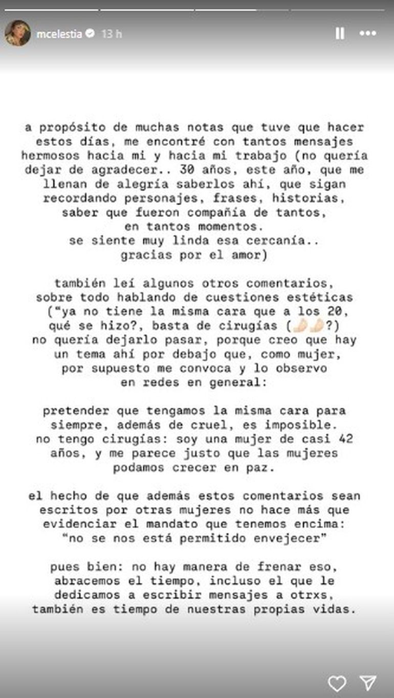 Por otra parte Celeste soltó: “Me encontré con tantos mensajes hermosos hacia mí y hacia mi trabajo... 30 años, este año, que me llenan de alegría saberlos ahí, que sigan recordando personajes, frases, historias, saber que fueron compañía de tantos, en tantos momentos”.