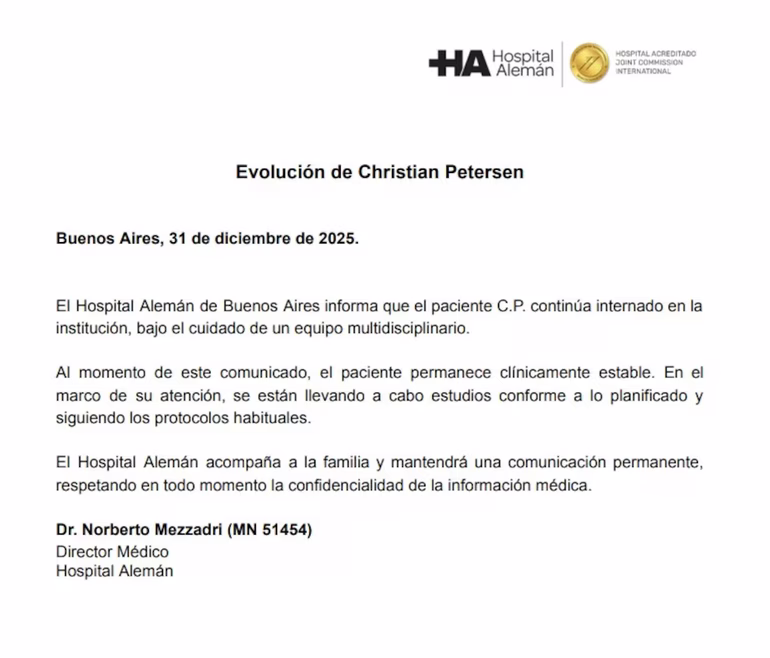 El comunicado, firmado por el director médico Dr. Norberto Mezzadri, indica que Petersen permanece internado en el centro de salud, bajo el monitoreo permanente de los médicos de la institución.