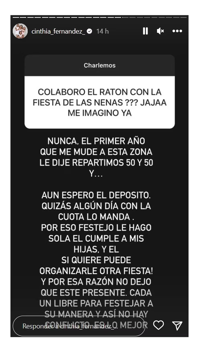 A través de Instagram, Cinthia reveló que Defederico no fue parte de la lista de invitados y compartió las razones tras una pregunta de uno de sus seguidores. Todo comenzó cuando una seguidora le preguntó sobre el padre de las niñas: “¿Colaboró el ratón con la fiesta de las nenas?”.