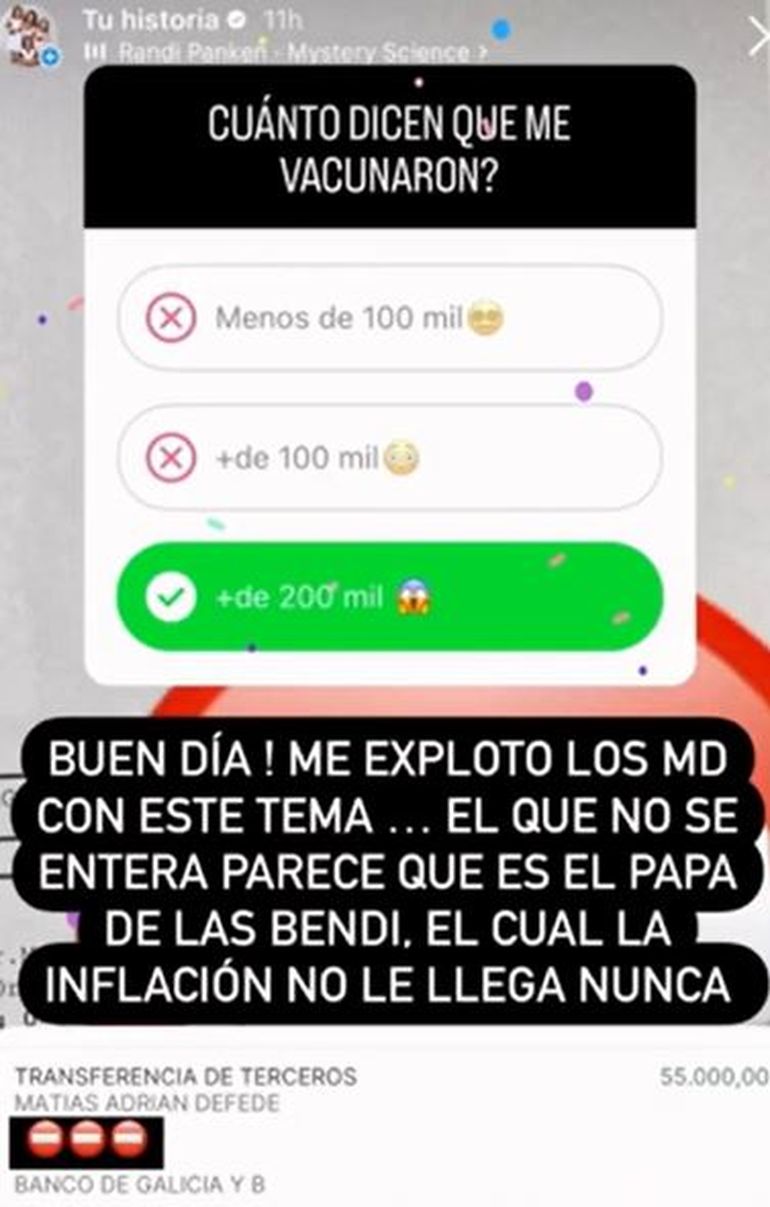 Luego de revelar que gastó más de 200 mil pesos, sumó el comprobante de la última transferencia que su ex, Matías, le hizo por la cuota alimentaria de sus tres hijas, Charis, Bella y Francesca. ¿Cuánto está pagando? solamente 55 mil pesos por mes por las tres. Una cifra totalmente alejada de la realidad y más teniendo en cuenta la actualidad económica del país.