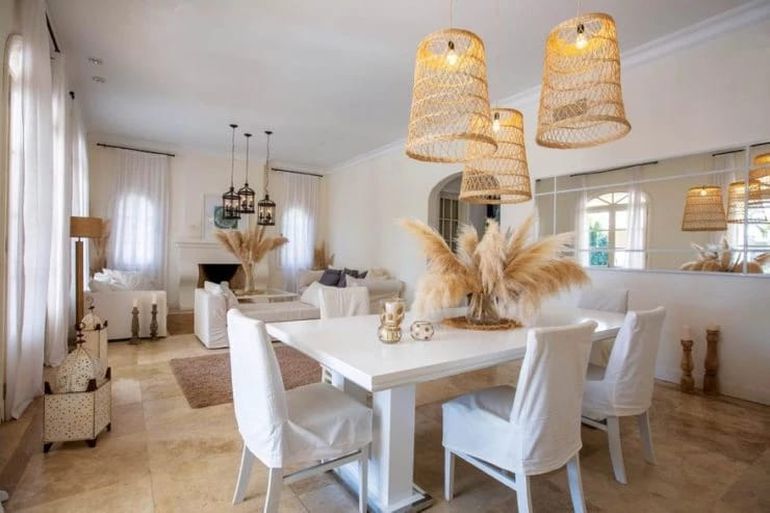 El color predominante en la sala de estar y el comedor de la casa de Flor Peña (se la alquila al empresario Matías Tasín, quien fue pareja de Jimena Barón y de Nicole Neumann) es el blanco, con muebles enfundados en telas lavables. Sobre la mesa principal hay tres lámparas con tulipas de mimbre, pisos de porcelanato y ventanas con hermosas arcadas.