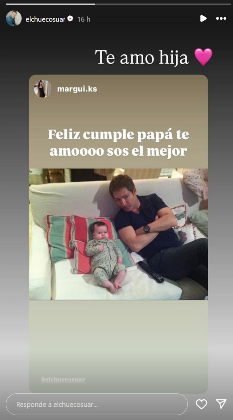 “Feliz cumple, papá. Te amo. Sos el mejor”, expresó Margarita junto a una postal en la que se la ve cuando era una beba, sentada en un sillón, al lado de su papá. “Te amo hija”, escribió el productor de televisión.