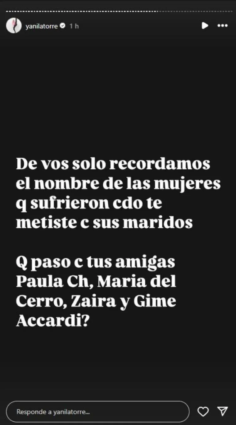 Entre las personas mencionadas están Paula Chaves, Mery del Cerro, Zaira Nara y Gimena Accardi. La responsable de difundir la información, no dudó en encender la mecha con una serie de publicaciones en la misma red, donde lanzó fuertes declaraciones: "De vos solo recordamos el nombre de las mujeres que sufrieron cuando te metiste con sus maridos. ¿Qué pasó con tus amigas Paula Chaves, María del Cerro, Zaira Nara y Gime Accardi?".