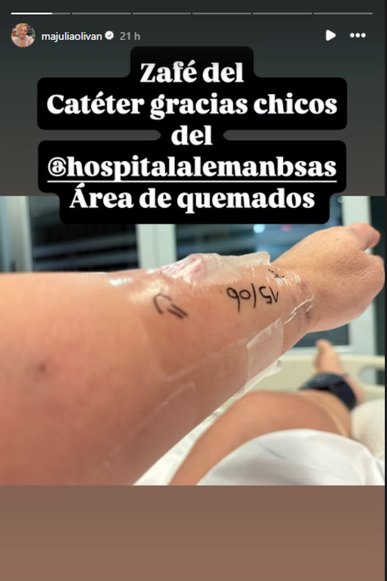 “Zafé del catéter. Gracias, chicos del Hospital Alemán del área de quemados”, destacó, mientras compartía una foto de su brazo durante la hospitalización, y mostraba su optimismo luego del lamentable hecho. Entre las muestras de cariño que recibió, María Julia también compartió los mensajes de fuerza que recibió de sus amigos, como de su marido y su hijo, Antonio.