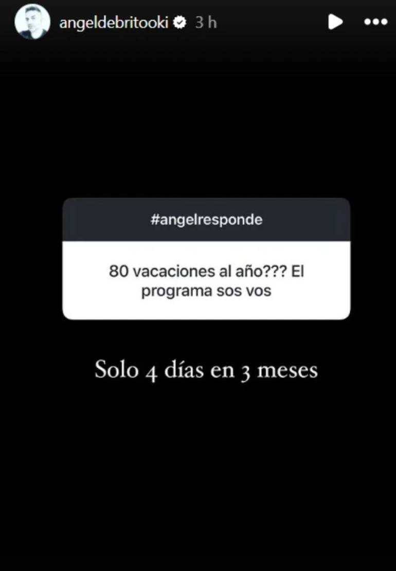 Más allá de todo eso, a través de su cajita de preguntas de Instagram, le escribieron un reclamo que fue acompañado de un elogio. “80 vacaciones al año. El programa sos vos”, fue el mensaje. “Solo 4 días en 3 meses”, le contestó el conductor de América TV.