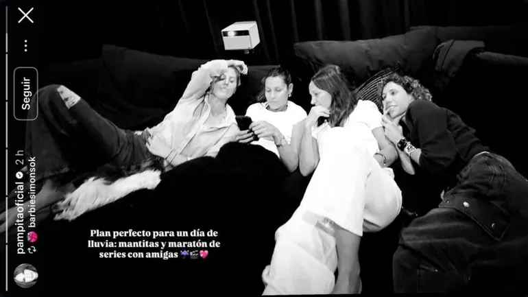 “Plan perfecto para un día de lluvia: mantitas y maratón de series con amigas”, escribió la modelo y se mostró en un gran sillón rodeada de sus amigas, mientras todas miraban la pantalla del celular que Pampita tenía en la mano.
