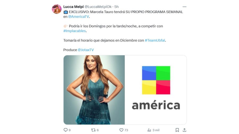 El periodista Lucca Melpi, exintegrante de Team Ubfal, dio la información a través de sus redes sociales y contó: "Exclusivo: Marcela Tauro tendrá su propio programa semanal en América TV".
