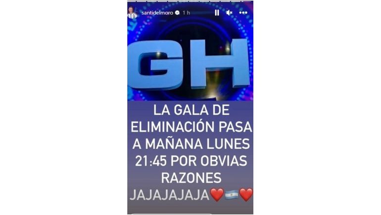 Quien dio la noticia de esta decisión fue Santiago del Moro, conductor del programa, que desde su cuenta de Instagram celebró la gran victoria argentina y anunció el cambio de día para la gala de eliminación.