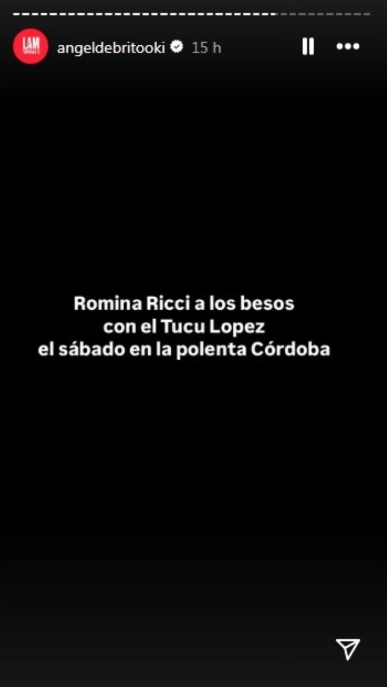 El conductor de Los Ángeles de la Mañana (LAM) fue quien reveló la información mediante sus historias de Instagram: "Romina Ricci a los besos con el Tucu López el pasado sábado en la fiesta Polenta de Córdoba".