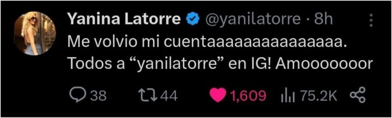 Finalmente, Yanina Latorre logró recuperar su cuenta de Instagram y regresó con entusiasmo. A través de sus Stories, expresó su alegría: "¡Volví, amoooor! Los amo, en un rato actualizo. Estoy contenta".