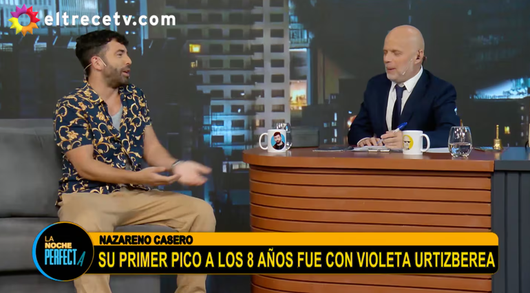 Con el objetivo de dar un marco de suspenso, el conductor insistió “si esto es verdad, es una noticia para el mundo del espectáculo”. “¿Es verdad que tu primer beso en la boca fue con Violeta Urtizberea?”, le preguntó, sin filtro, el conductor de El Trece. Ante la sorpresiva pregunta, el actor confesó, “eramos muy chicos”. Nazareno Casero comentó que tenía alrededor de 8 años en ese momento, juego de infancias.