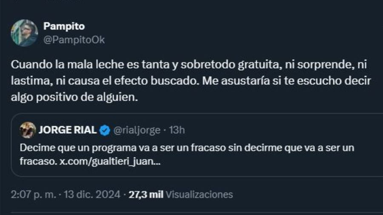 En respuesta, Pampito, citando el comentario del conductor de Argenzuela, lanzó: "Cuando la mala leche es tanta y sobretodo gratuita, ni sorprende, ni lastima, ni causa el efecto buscado. Me asustaría si te escucho decir algo positivo de alguien", sentenció sobre el ex conductor de TV Nostra y panelista de Intrusos, Mañanísima, entre otros.