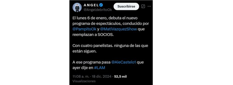Según confirmó Ángel de Brito en su cuenta de X, "el lunes 6 de enero debuta el nuevo programa de espectáculos, conducido por @PampitoOk y @MatiVazquezShow que reemplazan a Socios".