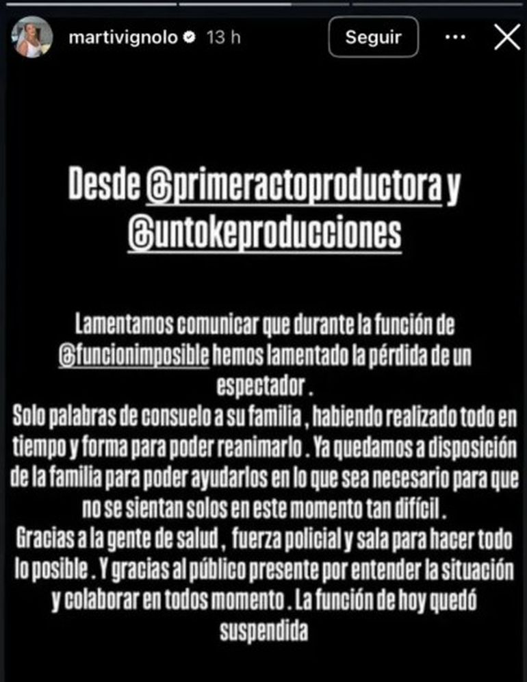 “Lamentamos comunicar que durante la función de @funcionimposible hemos lamentado la pérdida de un espectador. Solo palabras de consuelo a su familia, habiendo realizado todo en tiempo y forma para poder reanimarlo”, dijeron las producciones Primer Acto Productora y Juntoke Producciones.