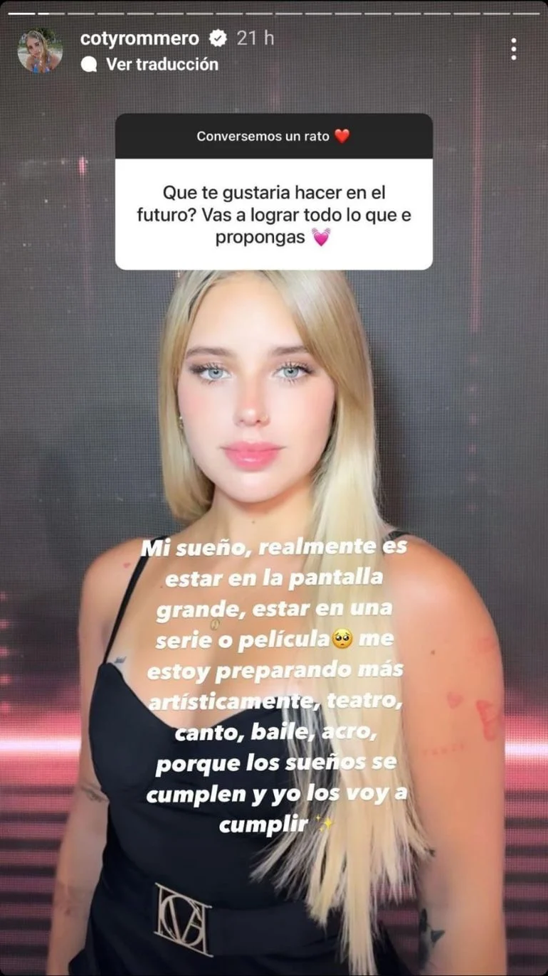 Una de las inquietudes decía: “¿Qué te gustaría hacer en el futuro? Vas a lograr todo lo que te propongas”. Y allí, ella reveló como se ve en ese sentido: “Mi sueño, realmente es estar en la pantalla grande, estar en una serie o película. Me estoy preparando más artísticamente, teatro, canto, baile arco, porque los sueños se cumplen y yo los voy a cumplir”.