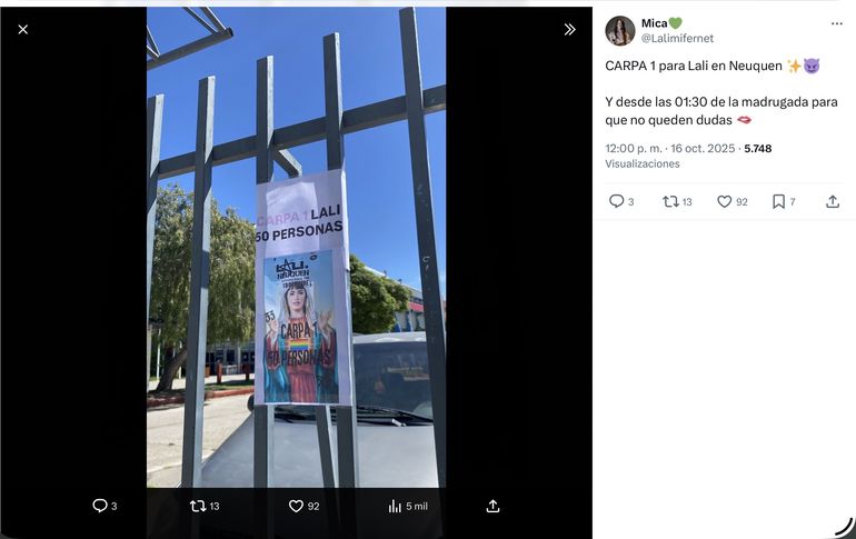 “CARPA 1 para Lali en Neuquén. Y desde las 01.30 de la madrugada para que no queden dudas”, escribió una usuaria de X junto a una foto en la que se ve las rejas del estadio Ruca Che con una foto de Lali y la leyenda “Carpa 1. Lali. 50 personas”.
