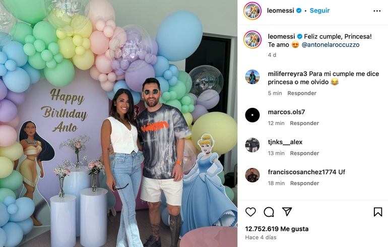 Inmediatamente, la publicación se hizo viral, superó los 10 millones de likes y tuvo más de 100 mil comentarios, saludando a Antonela o felicitando a Messi por su esposa. “Feliz cumple para Anto”, “El único fiel”, “Vos sos su héroe”, “Qué facha el ídolo. Feliz cumpleaños a nuestra primera dama”, “El único que se le puede decir que es un verdadero hombre”, “Los más hermosos del universo”, “La princesa de nuestro capitán”, fueron algunos de los comentarios que recibieron.