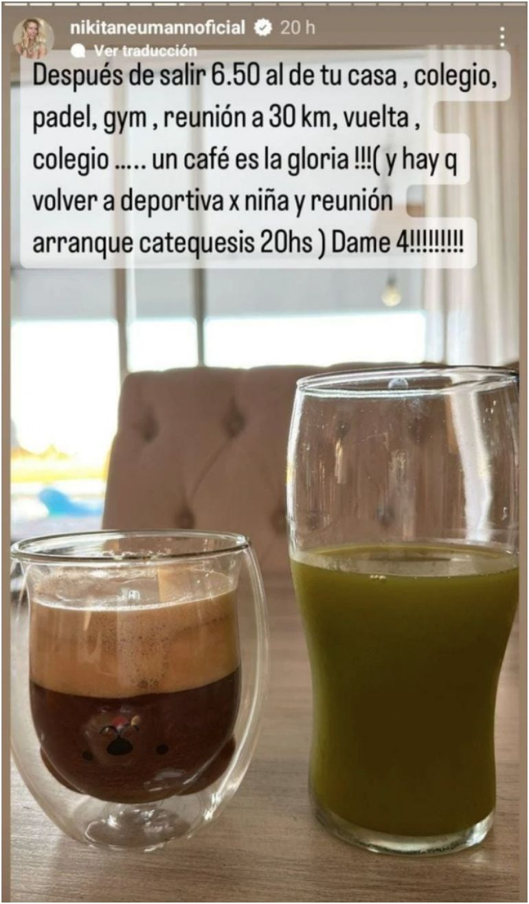 "Después de salir 6.50 de tu casa... Colegio, padel, gym, reunión a 30 km, vuelta, colegio... Un café es la gloria. Y hay que volver a deportiva por la niña y reunión de arranque de catequesis a las 20.00. ¡Dame cuatro!", escribió la modelo junto a la foto de las dos bebidas en cuestión, mientras relató todo lo que tenía que hacer en el día.