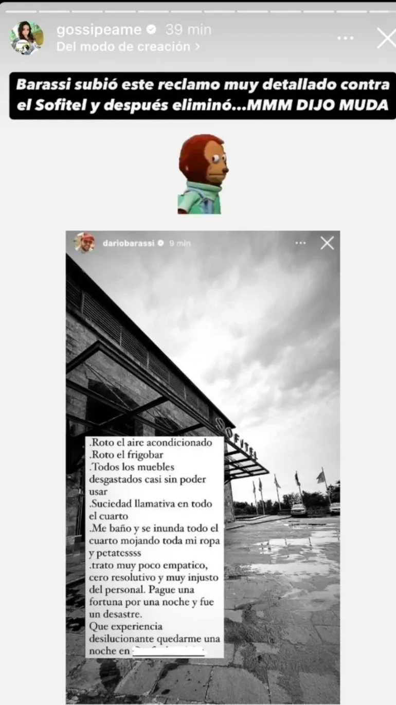 La atención del personal también fue uno de los puntos fuertes de su queja. Barassi describió al equipo del hotel como "poco empático" y "cero resolutivo", sugiriendo que sus intentos por resolver los inconvenientes fueron infructuosos. "Trato muy poco empático, cero resolutivo y muy injusto del personal", agregó en su publicación.