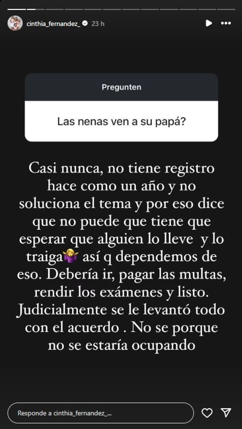 “Las nenas, ¿ven al papá?”, preguntó uno de los seguidores de la bailarina. La respuesta de Cinthia fue contundente: “Casi nunca”. Luego, se explayó al respecto: “No tiene registro hace un año y no soluciona el tema. Por eso dice que no puede, que tiene que esperar que alguien lo lleve y lo traiga. Así que dependemos de eso”.