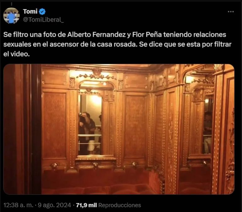 Sucede que desde la cuenta de Twitter de Tomi Libertario, expusieron una foto de lo que habría sido el fogoso encuentro de Florencia Peña y Alberto Fernández: “Se filtró una foto de Alberto Fernández y Flor Peña teniendo relaciones sexuales en el ascensor de la Casa Rosada. Se dice que se está por filtrar el video”.