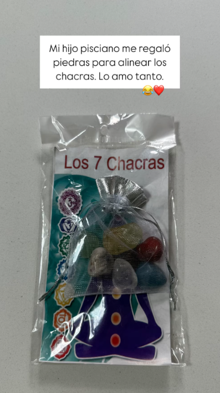 Por su parte, Momo no tiene redes sociales, pero se encargó de hacerle un especial regalo a su mamá, quien no dudó en compartirlo con sus seguidores. En la historia que subió se puede ver un paquete con una bolista transparente que dentro tiene unas piedras de colores. “Mi hijo, pisciano, me regaló piedras para alinear las chacras. Lo amo tanto”, explicó la actriz de Esperanza Mía. Esto no fue todo lo que recibió por su cumpleaños, sino que los dos hombres de su vida le cumplieron sus caprichos.